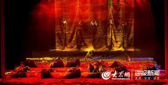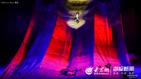 《黄河船夫曲》的曲调响起,奔腾、翻滚的“黄河”倾泻而下,以“瀑布”之势悬挂于舞台之上,甚为壮观!一些黄河人纷纷跳进眼前这条斜坡很大的“黄河”中,他们时而空中翻腾,时而水中追逐……当特殊时期来临,眼前的“黄河”开始颤抖,一群人陆续“跳进”这河里,在浊浪翻滚中逆流而上……“轰隆隆”的声响过后,一个个钢盔从“黄河”中倾泻而下,此时,怒涛滚滚的“黄河”与激流勇进的“黄河人”融为一体……突然,周围的一切戛然而止。灯亮后,《保卫黄河》熟悉的曲调响起,观众席掌声雷鸣,很多人跟着曲调轻声哼唱“风在吼马在叫,黄河在咆哮黄河在咆哮!”最后一个乐章《黄河入海流》,同样夺目,尤其是《红绸舞黄河》。在纱幕营造的“黄河瀑布”下,一对男女舞动红绸,在红色与黄色的交替中,一群人走着舞、跳着舞、后空翻舞、旋转舞,红绸或打着圈圈、或漫天飞舞,演员好像也在空中“飞起来”……《黄河》12个节目的精彩各有不同,无法一一道尽,如同掌声“停不下来”一样。